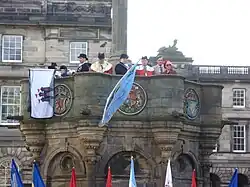 The Riding of the Marches is a modern revival of a tradition that stopped in the early 1700s. It is an annual event held in Edinburgh to commemorate the return in the year 1513 of the Captain of the City Band, Randolph Murray clasping the Ancient 'Blue Blanket Banner' (the banner of the Edinburgh tradesmen, said to have been awarded to the craftsmen of Edinburgh by James III in 1482) with news of the defeat of the Scottish Army at the Battle of Flodden.[16]
