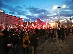 The Independence March (Polish: Marsz Niepodległości) is an annual patriotic and nationalist demonstration in Warsaw held on Poland's Independence Day, November 11. Since 2011, the March has attracted annually up to 100 thousand participants.[1][2][3][4] In 2020, the March was organized similar to one of a car procession.[5] Major participating organizations have included the Confederation, the National Radical Camp, the All-Polish Youth and Law and Justice.[6][7]