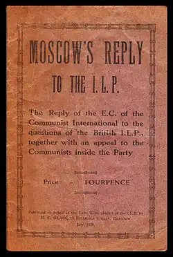 - ^ R. C. Wallhead and Clifford Allen, "Letter to ECCI", 21 May 1920. Reprinted in Left Wing Group of the ILP, Moscow's Reply to the ILP: The Reply of the EC of the Communist International to the Questions of the British ILP, together with an Appeal to the Communists Inside the Party. Glasgow: H. C. Glass for the Left Wing Group of the ILP, July 1920, pp. 2–3.