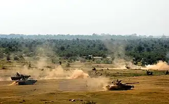 India is re-organising its mechanised forces to achieve strategic mobility and high-volume firepower for rapid thrusts into enemy territory. At present, the Indian army has severe deficiencies in its artillery (particularly self-propelled guns) and ammunition stocks, not to mention the inability of some of its modern tanks to operate in the heat and dust of the desert regions around the international border.[146] India proposes to progressively induct as many as 248 Arjun MBT and to develop and induct the Arjun MK-II variant, 1,657 Russian-origin T-90S main-battle tanks, apart from the ongoing upgrade of its T-72 fleet. Arjun MK-II trials had already begun in August 2013.[147] The improved features of the MK-II version of Arjun are night vision capabilities with a thermal imaging system for detecting all kinds of missiles, Explosive Reactive Armour (ERA), mine ploughs, the ability to fire anti-tank missiles with its 120 mm main gun, an Advanced Air Defence gun capable of shooting down helicopters with a 360-degree coverage, Automatic Target Tracking (ATT) lending a greater accuracy when it comes to moving targets and superior Laser Warning and Control systems. The Indian Army will upgrade its entire Boyevaya Mashina Pekhoty-2 (BMP-2)/2K infantry combat vehicle (ICV) fleet to enhance their ability to address operational requirements. Upgrades include integration of the latest generation fire control system, twin missile launchers and commander's thermal imaging panoramic sights, anti- tank guided missiles, as well as automatic grenade launchers.[148]