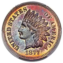 In the postwar years, the heavy production of cents was scaled back, as hoarding ceased and some of the slack was taken up by other base-metal coins.[43] Nevertheless, the various issues of small coins, at that time not redeemed by the government, caused another glut in commerce, which was not completely broken until the Act of March 3, 1871, allowed redemption of cents and other minor coins in lots of $20 or more.[38] Pursuant to this act, over thirty million copper-nickel cents, of both the Indian Head and Flying Eagle designs, were redeemed; the Mint melted these for recoinage. Fifty-five million bronze cents were also sold to the government; beginning in 1874, the Mint re-issued these in response to commercial requests for cents, lowering the demand for new coins.[44] Drops in the price of silver brought coins of that metal, hoarded for a decade or more, back into commerce, also decreasing demand. Between 1866 and 1878, production only occasionally exceeded ten million; the 1877 coin, with a circulation mintage of 852,500, is a scarcer date for the series.[43] After 1881, there were few redemptions of bronze cents, due to high demand for the denomination, though copper-nickel cents continued to be redeemed and melted.[45]