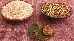 | Bhuja | ![]() | A mix of puffed rice, roasted gram, flattened corn, peanuts and namkeen that originated Eastern India and is widely popular there. It is a spiced mix of crackers, dried noodles, dried peas, peanuts, and other dried nuts with the main ingredient being puffed rice. |