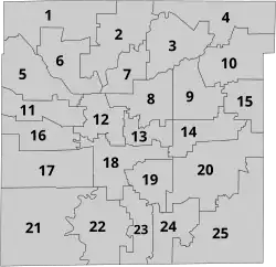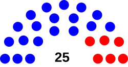 Following the 2019 elections, Democrats expanded their control of the council with a 20–5 majority.[15][16] This marked the first time in Indianapolis history that Democrats have held a supermajority on the council.[17] The clerk of the council is Yulonda Winfield.