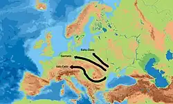 Albanian, Greek, and other Paleo-Balkan languages had their core in the Balkans after the Indo-European migrations in the region.[3][4] Proto-Celtic and Proto-Italic may have developed from Indo-European languages coming from Central Europe to Western Europe after the 3rd millennium BCE Yamnaya migrations into the Danube Valley,[5][6] while Proto-Germanic and Proto-Balto-Slavic may have developed east of the Carpathian Mountains, in present-day Ukraine,[7] moving north and spreading with the Corded Ware culture in Middle Europe (third millennium BCE).[8][9][web 1][10][web 2][11]