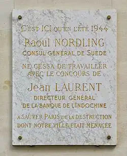 During World War II, the Banque de l'Indochine was chaired by Paul Baudoin, who in the summer of 1940 was the first Foreign Minister of Vichy France. In 1941, the Banque de l'Indochine was allowed to acquire an equity stake in its rival the Banque de Paris et des Pays-Bas.[33] The chief executive, Jean Laurent, in contrast to Baudoin, was involved in the French Resistance. Largely thanks to him, the bank avoided participation in the worst aspects of collaboration while providing some support to the Resistance. In August 1944, its Paris headquarters was the venue for the negotiation between Swedish diplomat Raoul Nordling and German commander Dietrich von Choltitz to limit bloodshed during the Liberation of Paris.[34] The Banque de l'Indochine, like the BPPB, was subsequently able to escape nationalization following the liberation of France, even though Baudoin was sentenced to Indignité nationale.[35]