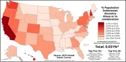Indonesian Americans are migrants from the multiethnic country of Indonesia to the United States, and their U.S.-born descendants.[4] In both the 2000 and 2010 United States census, they were the 15th largest group of Asian Americans recorded in the United States as well as one of the fastest growing.[5][6][7]