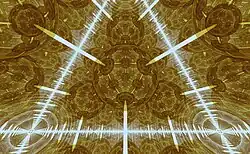 "Indra's net" is an infinitely-large net owned by the Vedic deva Indra, which hangs over his palace on Mount Meru, the axis mundi of Buddhist and Hindu cosmology. In East Asian Buddhism, Indra's net is considered as having a multifaceted jewel at each vertex, with each jewel being reflected in all of the other jewels.[4] In the Huayan school of Chinese Buddhism, which follows the Buddhāvataṃsaka Sūtra, the image of "Indra's net" is used to describe the interconnectedness or "perfect interfusion" (yuánróng, 圓融) of all phenomena in the universe.[4][5]