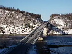 The Indre Sunnan Bridge (Norwegian: Indre Sunnan bru) is a cantilever bridge in Bodø Municipality in Nordland county, Norway. It crosses a strait between the island of Straumøya and the village of Tuv on the mainland. The Saltstraumen strait and its famous maelstrom lie just a short distance to the northeast. The bridge is 360 metres (1,180 ft) long and the main span is 165 metres (541 ft).[1]