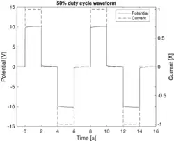 In the time-domain induced polarization method, the voltage response is observed as a function of time after the injected current is switched off or on.[4]