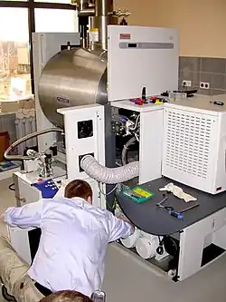 Infrared photodissociation (IRPD) spectroscopy uses infrared radiation to break bonds in, often ionic, molecules (photodissociation), within a mass spectrometer.[1] In combination with post-ionization, this technique can also be used for neutral species. IRPD spectroscopy has been shown to use electron ionization, corona discharge, and electrospray ionization to obtain spectra of volatile and nonvolatile compounds.[2][3] Ionized gases trapped in a mass spectrometer can be studied without the need of a solvent as in infrared spectroscopy.[4]