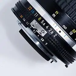 Many manual focus lenses for 35 mm single-lens reflex cameras (SLR) and medium format SLR have a red dot, line or diamond, often with a red "R" called the infrared index mark, which can be used to achieve proper infrared focus; many autofocus lenses no longer have this mark. For these lenses, after visual focus is achieved for the intended subject, the distance indicated by the visual focusing mark is then re-set to the infrared index mark.[21] Without refocusing, a sharp infrared photograph can be taken by proper hyperfocal settings, which generally requires a tripod, a narrow aperture (like f/8); however, wider apertures like f/2.0 can produce sharp photos when the lens is meticulously refocused to the infrared index mark, and only if this index mark is the correct one for the filter and film in use. Diffraction effects inside a camera are greater at infrared wavelengths so that stopping down the lens too far may actually reduce sharpness.