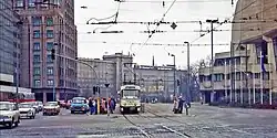 - the 361 meter long (1184 ft.) eastern section[13] of the Goerdelerring (named after the Mayor of Leipzig, Carl Friedrich Goerdeler; formerly the separate Fleischerplatz and Schulplatz squares, which were combined into Friedrich-Engels-Platz in 1945), which follows the course after passing the "round corner"-building[14] continues in a north-easterly direction - the section of the Geordelerring running west between Pfaffendorfer Straße and Jacobstraße and merging into the Ranstädter Steinweg can, because of the after World War II changed road layout are no longer assigned to the actual inner city ring road,