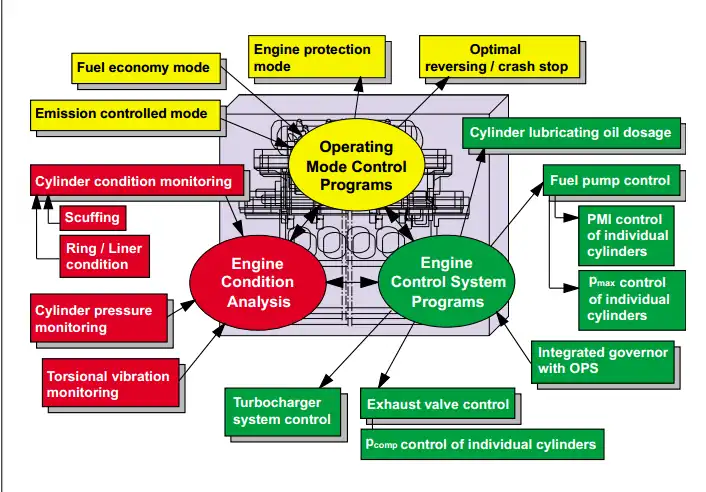 The concept of the intelligent engine revolves around the idea that the engine is thinking for itself. The brain of the system is an electronic control system that analyzes the condition of the engine and the operation of the engine’s system (The fuel injection, exhaust valve, cylinder lube oil and turbo charging system). Along with the control and timing needed to make the diesel run smoothly, the intelligent diesel goes beyond that by monitoring and evaluating the condition of the engine, based on engine conditions the smart system can actively protect the engine from damage due to overload, lack of maintenance and maladjustment.[1] The intelligent engines’ finite control gives the bridge the ability to manually adjust more variables than the current camshaft system. Along with manual controls, operators can specifically design programs that optimize fuel economy, emission, turbo output, allowing for high performance under different loads.[3]