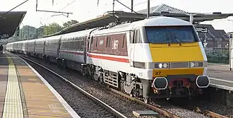 By spring 1984, favour was being given towards the adoption of a tilting carriage, tentatively designated as the Mk 4; this was viewed as superior to the existing Mk 3 and enabled a single design to be shared between the ECML and WCML.[11] At one point, it was envisaged that the InterCity 225 would be ubiquitous, even potentially having the capability built into it to operate over the southern third-rail network and within the Channel Tunnel; by mid 1984, such fanciful ideas were curtailed. Furthermore, it was decided to reduce the freight haulage capabilities of the InterCity 225, as traction for this sector was instead intended to be served via other platforms.[11] The emergence of the Class 90, derived from the existing Class 87, somewhat reduced the pressure for the InterCity 225, reducing the prospective numbers to be built of the latter. Without tilting carriages, it had little speed advantage over the Class 90 on the WCML.[11]
