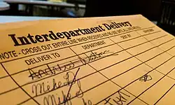 This is the name for mail which is sent and received between employees and departments.[2] Internal mail will often use a special envelope which can be reused. It is common for them to have many address boxes that are used in order. The most recent box is the current delivery address.[3]