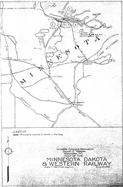 Minnesota Dakota and Western Railway (reporting mark MDW) is a shortline railroad operating 4 miles of track between International Falls and Ranier, Minnesota as well as between International Falls and Fort Frances, Ontario via the Fort Frances – International Falls International Bridge, which is jointly owned by MDW and Abitibi Consolidated. The railroad served the paper mills in both International Falls and Fort Frances until the Fort Frances mill closed in 2014.[1] The railroad interchanges with Canadian National at Ranier.