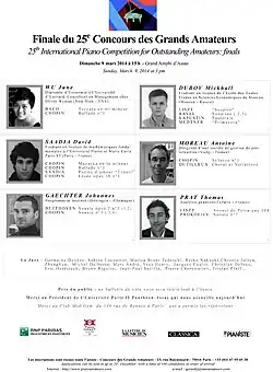 The competition has met with considerable success over the years, attracting hundreds of candidates from more than 50 countries worldwide.[3] One of the basic principles of the competition is the free choice of programme. There are no set pieces. The aim is not to limit the candidates, but to discover the works of musicians of their own choosing. Gérard Bekerman, the founder of the competition, claims that in Paris, the desire to "win" is outweighed by the love of music: "Pianists discover that the Competition for Outstanding Amateurs is not a competition but an 'anti-competition'. There are no opponents, no competitors, no judges, just music lovers".[3]