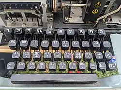 Baudot's 5-bit code was adapted to be sent from a manual keyboard, and no teleprinter equipment was ever constructed that used it in its original form.[8] The code was entered on a keyboard which had just five piano-type keys and was operated using two fingers of the left hand and three fingers of the right hand. Once the keys had been pressed, they were locked down until mechanical contacts in a distributor unit passed over the sector connected to that particular keyboard, at which time the keyboard was unlocked ready for the next character to be entered, with an audible click (known as the "cadence signal") to warn the operator. Operators had to maintain a steady rhythm, and the usual speed of operation was 30 words per minute.[9]