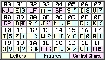 [...] the characters that are 'transmission control' related [...] are bit-wise symmetrical – the codes for FIGS, LTRS, space and BLANK – are the same reversed left to right! Further, the codes for CR and LF, equal each other when reversed left to right!