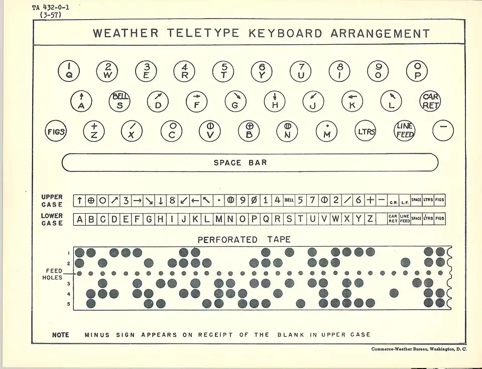 Meteorologists used a variant of ITA2 with the figures-case symbols, except for the ten digits, BEL and a few other characters, replaced by weather symbols: