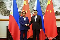 After his trip to Hong Kong, President Duterte flew to Beijing, China to attend the One Belt One Road forum of Chinese President Xi Jinping. During the sidelines of the forum, Duterte had a bilateral meeting with Mongolian Prime Minister Jargaltulgyn Erdenebat.[115] In a press statement, the Malacañang said, “The two leaders exchanged views on expanding interaction in many areas, including in agriculture, trade and investment, finance, and tourism, among others.” Both leaders expressed their desire to visit each other's countries in a convenient date. Duterte also met Turkish President Recep Tayyip Erdoğan informally.[116] Both Mongolia and Turkey expressed their interest to join the ASEAN according to Duterte.[117] At the first day of the forum, Duterte didn't attend the opening ceremony of the Belt and Road Forum.[118] According to the Department of Foreign Affairs, Duterte was working on preparations for his meetings on May 15. Duterte later attended the BRF welcome dinner hosted by President Xi Jinping at the Great Hall of the People. At the second and last day of the forum, Duterte attended the Leaders Roundtable Session I and II at the Yanqi Lake International Convention Center. According to the Department of Foreign Affairs, the topics that were discussed include infrastructure connectivity; economic and trade cooperation; industrial investment; energy and resources; financial support; people-to-people exchanges; ecological and environmental protection; and marine cooperation.[119] After his attendance to the Belt and Road Forum, he had a bilateral meeting with Chinese Premier Li Keqiang. Later, he also had a bilateral meeting with President Xi. Four agreements on economic and technical cooperation, cooperation in human resource development, energy cooperation, and news and publishing were signed.[120] Duterte later departed Beijing at the evening.[121][122]