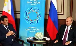 On the sidelines of the meeting, President Duterte held bilateral meetings with Chinese President Xi Jinping and Russian President Vladimir Putin. Duterte met with Xi to discuss the alignment of the former's foreign policy towards Asian economic development, to follow up on the memorandum of understandings signed during the former's state visit to Beijing in October, and to discuss the permission of Filipino fisherman to enter the disputed Scarborough Shoal.[73] Duterte met with Putin to discuss the development of Philippines–Russia relations. Duterte also praised Putin's leadership skills, calling him his "idol", and the latter invited the former to visit Russia.[74][75]