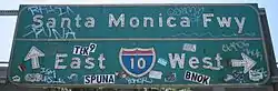 Interstate 10 (I-10) is a transcontinental Interstate Highway in the United States, stretching from Santa Monica, California, to Jacksonville, Florida. The segment of I-10 in California, also known as the Pearl Harbor Memorial Highway,[4] runs east from Santa Monica through Los Angeles, San Bernardino, and Palm Springs before crossing into the state of Arizona. In the Greater Los Angeles area, it is known as the Santa Monica and San Bernardino freeways, linked by a short concurrency on I-5 (Golden State Freeway) at the East Los Angeles Interchange. I-10 also has parts designated as the Rosa Parks and Sonny Bono Memorial freeways.[5] Some parts were also formerly designated as the Christopher Columbus Transcontinental Highway.[6] However, the California State Legislature removed this designation following the passage of a bill on August 31, 2022.[7][8] I-10 is also known colloquially as "the 10" to Southern California residents .