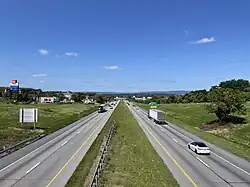 I-283 begins at the Harrisburg East interchange of I-76 (Pennsylvania Turnpike) in Lower Swatara Township, Dauphin County; this interchange is a trumpet interchange. Past the interchange toll plaza, the road continues north and immediately reaches a partial cloverleaf interchange with the PA 283 freeway that also has access to PA 230 via Eisenhower Boulevard. I-283 continues north-northwest as a four-lane freeway, running past business parks before entering areas of farms and woods, crossing into Swatara Township. The road enters commercial areas as it comes to a diamond interchange with PA 441. After that exit, the road continues northwest before turning north and passing an industrial park. I-283 comes to its northern terminus at the Eisenhower Interchange with I-83/US 322 (Capital Beltway), at which point the freeway continues north as part of I-83 northbound/US 322 westbound along the Capital Beltway while I-83 southbound heads west along the Capital Beltway and US 322 eastbound heads east on a freeway.[2][3]