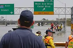 From the west, I-610 begins at the Jefferson–Orleans parish line, also the line between unincorporated Metairie and the city of New Orleans. Initially a four-lane freeway, I-610 branches off of I-10 at exit 230 as it crosses over the 17th Street Canal into the Lakeview neighborhood of New Orleans. While I-10 swings southward toward the Central Business District via the Pontchartrain Expressway, I-610 heads due east through a partial cloverleaf interchange (exit 1A) connecting with the one-way couplet of West End and Pontchartrain boulevards. This interchange also serves to connect westbound I-610 to eastbound I-10. Immediately to the east, exit 1A also encompasses a tight diamond interchange with Canal Boulevard, a divided north–south thoroughfare in Lakeview.[2][3][4]