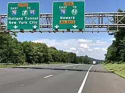 Interstate 78 (I-78) is an east–west route stretching from Union Township, Lebanon County, Pennsylvania, to New York City. In New Jersey, I-78 is called the Phillipsburg–Newark Expressway and the Newark Bay Extension of the New Jersey Turnpike. The highway runs for 67.83 miles (109.16 km) in the northern part of the state of New Jersey from the Interstate 78 Toll Bridge over the Delaware River at the Pennsylvania state line in Phillipsburg, Warren County, east to the Holland Tunnel under the Hudson River at the New York state line in Jersey City, Hudson County. The Phillipsburg–Newark Expressway portion of I-78, formally called the Lightning Division Memorial Highway, runs from the Phillipsburg area east across rural areas of Western New Jersey before entering suburban areas in Somerset County. The road crosses the Watchung Mountains, widening into a local–express lane configuration at Route 24 as it continues through urban areas to Newark. Here, I-78 intersects the mainline of the New Jersey Turnpike (I-95) and becomes the Newark Bay Extension, crossing the Newark Bay Bridge and continuing to Jersey City. The route, along with Route 139, follows a one-way pair of surface streets to the Holland Tunnel.