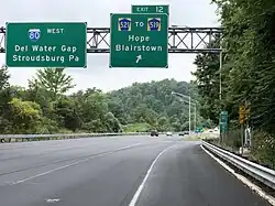 I-80 enters Hardwick Township, Warren County, from Pennsylvania on the Delaware Water Gap Toll Bridge over the Delaware River, maintained by the Delaware River Joint Toll Bridge Commission.[4] In addition to carrying I-80, this bridge also carries the Appalachian Trail over the Delaware River. From this point, the four-lane freeway heads south along the east bank of the river through the Delaware Water Gap, immediately reaching a westbound exit and eastbound entrance for Old Mine Road.[4][6] Now maintained by the New Jersey Department of Transportation, the road makes a sharp turn to the east and comes to a u-turn ramp in both directions that also has access to the Appalachian Trail.[4] The highway heads south again and enters Knowlton Township, where it comes to another set of U-turn ramps that also includes a weigh station in the eastbound direction. After turning southeast and leaving the Delaware Water Gap, the road has a westbound right-in/right-out for Hainesburg Road before crossing under the abandoned Delaware River Viaduct of the Lackawanna Cut-Off. East of the viaduct, I-80 widens to six lanes and reaches a complex interchange with the western terminus of US 46, Route 94, and Decatur Street in Columbia, where development near the route increases. After this interchange, the freeway turns east away from the Delaware River and crosses over Paulins Kill before it continues through wooded and hilly areas containing some farms, with the eastbound direction widening from three to four lanes, and the highway median also widens. A scenic overlook of the Delaware Water Gap is located in the westbound direction while a rest area is located in the eastbound direction.[4][6]