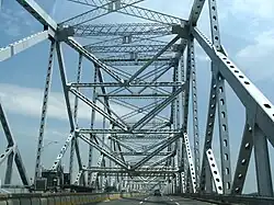 The original Tappan Zee Bridge, carrying the concurrency of New York State Thruway, I-87, and I-287, was a cantilever bridge built during 1952–55. The bridge was three miles (4.8 km) long and spanned the Hudson at its second-widest point. Before its replacement in 2017, the deteriorating structure carried an average of 138,000 vehicles per day, substantially more traffic than its designed capacity. During its first decade, the bridge carried fewer than 40,000 vehicles per day. Part of the justification for replacing the bridge stems from its construction immediately following the Korean War on a low budget of only $81 million (equivalent to $719 million in 2023[22]). Unlike other major bridges in New York metropolitan area, the Tappan Zee was designed to last only 50 years.[39] The Federal Highway Administration (FHWA) issued a report in October 2011 designating the Tappan Zee's replacement to be a dual-span twin bridge.[40]