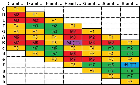 | 6 | Diminished fifth | d5 | Tritone | TT | ⓘ | ||
