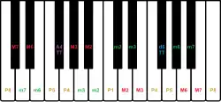 to the left, white keys are minor (except Perfect) and black keys are Major or Augmented.