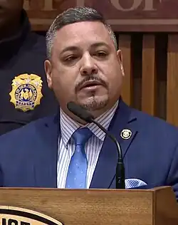Law enforcement interest in a wide swath of Adams's City Hall led to a number of unscheduled departures from the administration before Adams's indictment.[6] The New York City Department of Investigation and New York County District Attorney arrested Buildings Commissioner Eric Ulrich in 2023 for an alleged bribery scheme, forcing him to leave the administration. He awaits trial in New York Supreme Court.[7] A set of raids by IRS Criminal Investigation in 2024 led to the resignation of Police Commissioner Edward Caban.[8] Similar warrant seizures of phones by the Federal Bureau of Investigation preceded the resignation of Schools Chancellor David C. Banks and his brother, Deputy Mayor Philip Banks III.[9][10]