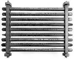 Iolo Morganwg developed his own runic system based on an ancient druid alphabet system, in Welsh Coelbren y Beirdd ("the Bardic Alphabet"). It was said to be the alphabetic system of the ancient druids. It consisted of 20 main letters, and 20 others "to represent elongated vowels and mutations."[9] These symbols were to be represented in a wooden frame, known as peithynen.