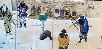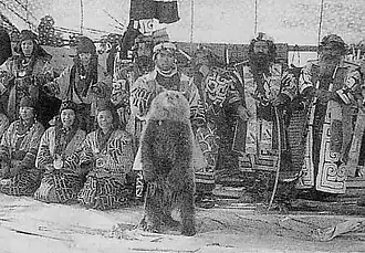 The festival grounds are typically set up right outside a home.[35] The coaxing of the bear cub out its cage may be conducted before the audience at the festival ground. The woman clap to rhythm raucously but melancholically,[40] singing the 'upopo (festival song) and dancing the rimse to entertain the bear.[41][42] After the bear is bound, it is made to wear a ponpake (literally "apron", and described as straw cape-like, but actually woven together into a sort of netting from wood-shavings, with decorated cloth called saranpe sewn ont it)[46]