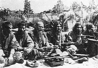 Due to the lack of archaeological evidence in Satsumon culture strata (until 1200 CE) for any sending rite ceremonies among the Ainu in Japan, there has developed the view that the simpler sending (hopunire) and iomante was probably transmitted from the Okhotsk culture (of the period to 13th century), which is associated with the Nivkh people, indirectly via the Tobinitai culture.[130] There certainly was a cultural transmission, and the change from earthenware to metalware usage marked the advent of the so-called "Ainu Culture", dated to approximately the 1450–1667 period,[131] and while it may be possible that a field-type sending rite might have been transmitted in that time fram, iomante in the narrower sense of "cub-fostering type sending" is not evident untile the so-called "New Ainu Culture" age (from later half of 18th century), Udagawa has argued one cannot establish a direct connection,[132] with some other explanation needed to bridge the gap.