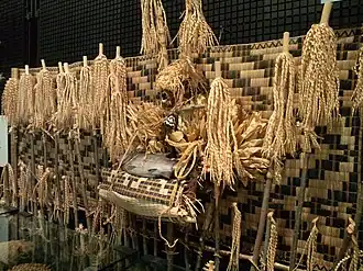 On the festival grounds, the nusasan ("god-food place", "god's altar") is set up where special inau wood-shaving sticks are propped up, and laid out with nikap-umbe (ornamental mat).[67] Various offerings from Ainu sword (emus), quiver (ikayop), sitoki (breast-ornament or necklace[68]), armor, and sintoko (vessels, lacquerware).[35][69] Also food items such as sito (dumplings made from millet[71] or nowadays rice flour),[g] dried fish, together with ceremonial arrows are bound together inside a rolled-up ornamental mat,[73] so that the god can shoulder it as a take-home gift (heper-sike).[38] Batchelor learned the name of the take-home gifts to be imoka-sike ("remembrance from the feast") and describes it as strung-up millet cakes.[74]