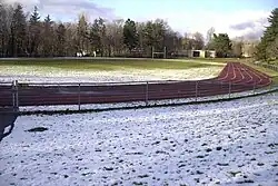 The many sports facilities are shared by various teams. The main artificial turf field is used for competition by several of the school's teams including football and lacrosse. It is enclosed by a 400-meter track equipped with steeplechase and long jump areas as well as an electronic scoreboard and a two-story press box. The rear of the school contains an updated baseball field, tennis courts, and areas for field sports. A fitness and weights room was recently renovated for use by athletes.[27]
