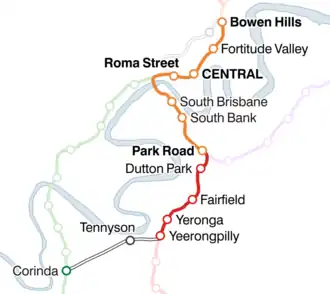 The section from Roma Street to Corinda (11 km (6.8 mi) was quadruplicated in 1963,[4] and extended to Darra (a further 5 km (3.1 mi)) in 2011, which became the junction for the first section of the new Springfield line at that time.