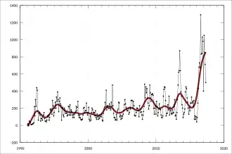 Iraqi immigration to Australia peaked between 1992 and 1995, with the Iraq-born population in Victoria increasing to 3,492 by 1996.[4] By 2001 this community had increased a further 74% to 6,091 people.[4] Most recent Iraqi immigrants have arrived under the Family and Skilled Migration categories. Some Iraqis have sought refugee status after arrival in Australia, and have been detained pending processing.
