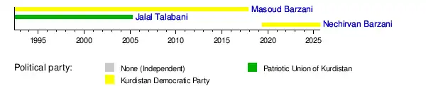 | 1 | | Masoud Barzani (born 1946) | 14 June 2005 | 1 November 2017 | 12 years, 140 days | Kurdistan Democratic Party |