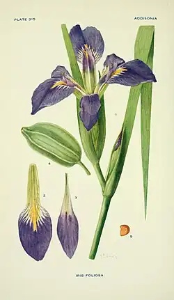Michael Foster was the first botanist and author to realise that Iris brevicaulis Raf. had the same description as Iris foliosa MacKenzie & Bush (published in Trans. Acad. Sci. St. Louis 12: 80–81. in 1902).[38] Later authors agreed with this assessment, including Brian Mathew (The Iris, 1981) and Clive Innes (The World of Iridaceae). But 'Iris foliosa' was used in the 1939 Checklist and 'Index Kewensis'.[8] But most authors have agreed that Iris foliosa is a synonym.[2]