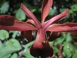 Iris fulva can easily hybridize with other Louisiana irises to create new variants. The first was 'Iris fulvala' a hybrid Dykes raised as a cross between Iris fulva and Iris brevicaulis. It produced two forms, both with rich velvety falls, one a red-purple form and the other was a bluer shade.[3][13] The name was composed of Iris fulva and the first syllable of Lamance (the common name of 'Iris foliosa' which was known at that time as Iris hexagona var. Lamancei). Later, Iris foliosa was found to be a synonym of Iris brevicaulis. The hybrids were found to be good garden plants and could flower more freely than either of the parents.[5] Other crosses include with Iris giganticaerulea to produce 'Iris × vinicolor' Small and also with Iris savannarum to produce 'Iris × cacique' (J. Berry) N. C. Henderson.[3]