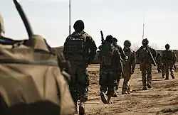 The Irish Guards were involved in the Balkans Conflicts when they were deployed to Macedonia and Kosovo in 1999 and were the first British unit to enter the Kosovan capital city of Pristina on 12 June. The regiment played a significant role in the initial stages of the Iraq War as part of the 7th Armoured Brigade and they led the British advance into Basra in March 2003.[27] The Irish Guards deployed to Iraq on Operation Telic 10 in 2007.[28] In 2010, the regiment deployed on their first tour of duty to Afghanistan.[29] Number 2 Company deployed to Afghanistan in 2013 as a Brigade Operations Company.[30][31]