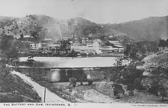 The two creeks which form the basis of the dam at Irvinebank were known as Gibbs Creek and McDonald Creek, after the earliest prospectors. The battery was erected on the Gibbs Creek frontage, and the dam was constructed just below the junction of these two creeks and embraced an area, when full, of about 12 - 13 acres (53,000 m2) of water, with depths varying from about 15 feet (4.6 m) down to about two or three feet.[1] The original capacity was 150 million litres (33,000,000 imp gal; 40,000,000 US gal).