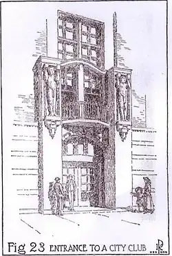 The new building embodied the soaring expectations of the reform movement, as well as providing the material comforts of a middle-class social club. Its two-story dining-lecture hall, complete with balcony and private eating chambers, accommodated over two hundred for the weekly luncheon talks on social and political issues of the day. ... Architect and club member Irving K. Pond declared that 'every line of the building illustrated some phase of the uplift movement.'[28]