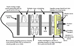 The ground product is separated from the grinding medium at the discharge end of the mill. This is achieved without using screens by using a patented product separator that consists of a rotor and a displacement body (see Figure 2 and Figure 4).[10] The relatively short distance between the last disk results in a centrifugal action that forces coarse particles towards the mill shell, from where they flow back towards the feed end.[10] This action retains the grinding medium within the mill.[10]