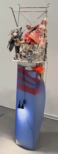 Since the end of the second half of the 1990s, Genzken has been conceptualizing sculptures and panel paintings in the shape of a bricolage of materials taken from DIY stores and from photographs and newspaper clippings.[20] She often uses materials that underline the temporary character of her works. As part of her deep-set interest in urban space, she also arranges complex, and often disquieting, installations with mannequins, dolls, photographs, and an array of found objects. New Buildings for New York are assembled from found scraps of plastic, metal and pizza-box cardboard.[21] The assemblages from the Empire/Vampire, Who Kills Death series, originally comprising more than twenty sculptures that were created following the attacks of September 11, are combinations of found objects – action figures, plastic vessels, and various elements of consumer detritus – arranged on pedestals in architecturally inspired, post-destruction scenes.[22] Elefant (2006) is a column of cascading vertical blinds festooned with plastic tubes, foil, artificial flowers, fabric and some tiny toy soldiers and Indians.[23] For her installation Oil, the artist transformed the German Pavilion at the 2007 Venice Biennale into a futuristic and morbid Gesamtkunstwerk.
